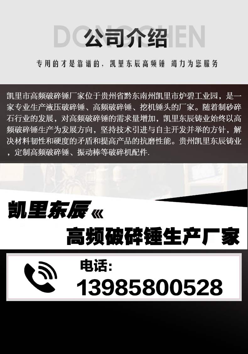 高頻破碎錘就是放到挖掘機、鉤機上使用的,它是一種高頻率的破碎巖層,松土的鉤機錘。在挖掘機領域高頻破碎錘的使用頻率可以說是相當厲害的。今天有人在愛番番上咨詢淮南市賣挖掘機破碎錘,我們可以很負責任的為大家回答一下,在淮南目前是沒有生產挖掘機破碎錘的廠家。如果朋友們需要您可以直接與凱里市東辰鑄業取得聯系,我們可以免費送貨上門哦。免費為您現場指導如何安裝,如果您感興趣的話趕快拿起您手中的電話與我們聯系輕。聯系熱線139-8580-0528龔經理。