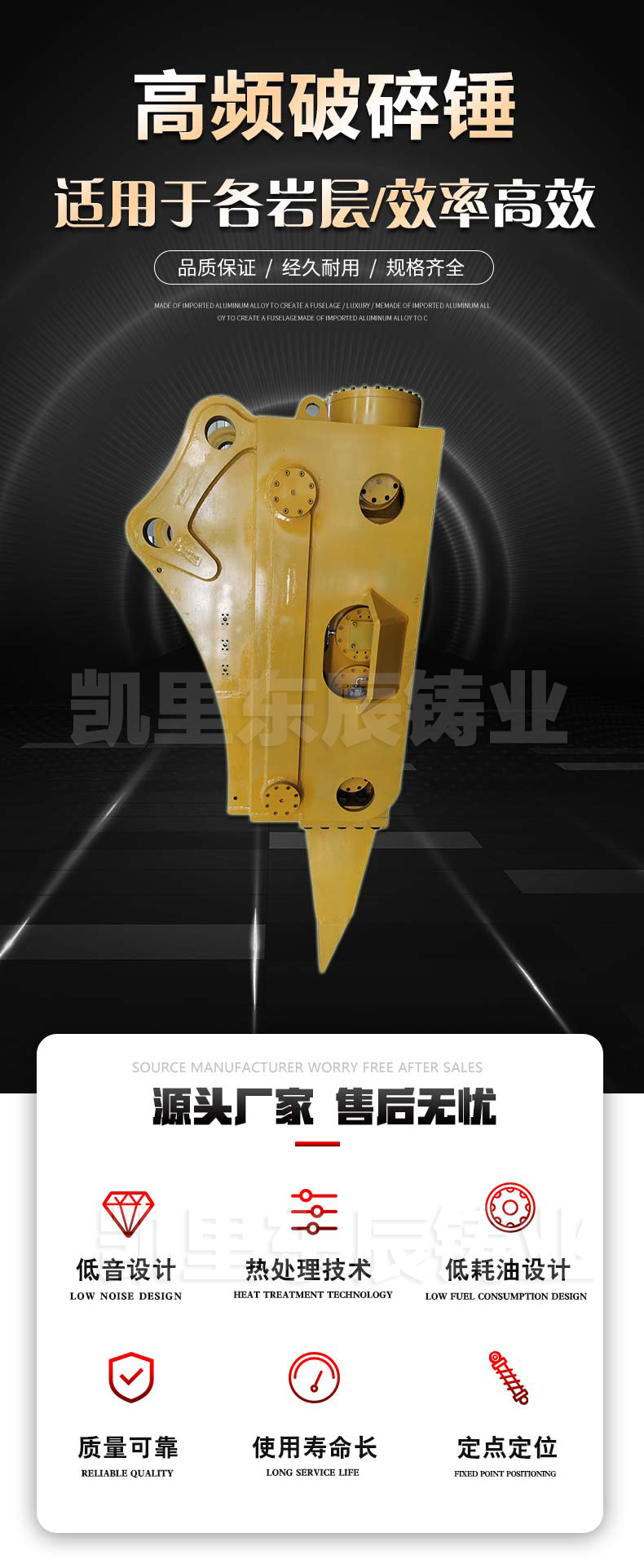 挖機高頻破碎錘廠家直銷,不租賃,安裝于挖掘機上使用,不含挖掘機,用于開山采石東辰司*生產的高頻破碎錘力量大、效率高、堅固耐用。從一開始此設備僅針對礦山等惡劣開采環境進行推廣,但由于其自身維修頻率低、損耗低、噪音低、工作效率高等諸多節能環保的優點,漸漸的開始進入城市化施工的領域內。在東歐一些發達地區已經逐漸的開始替代破碎器在城市建設中的角色。