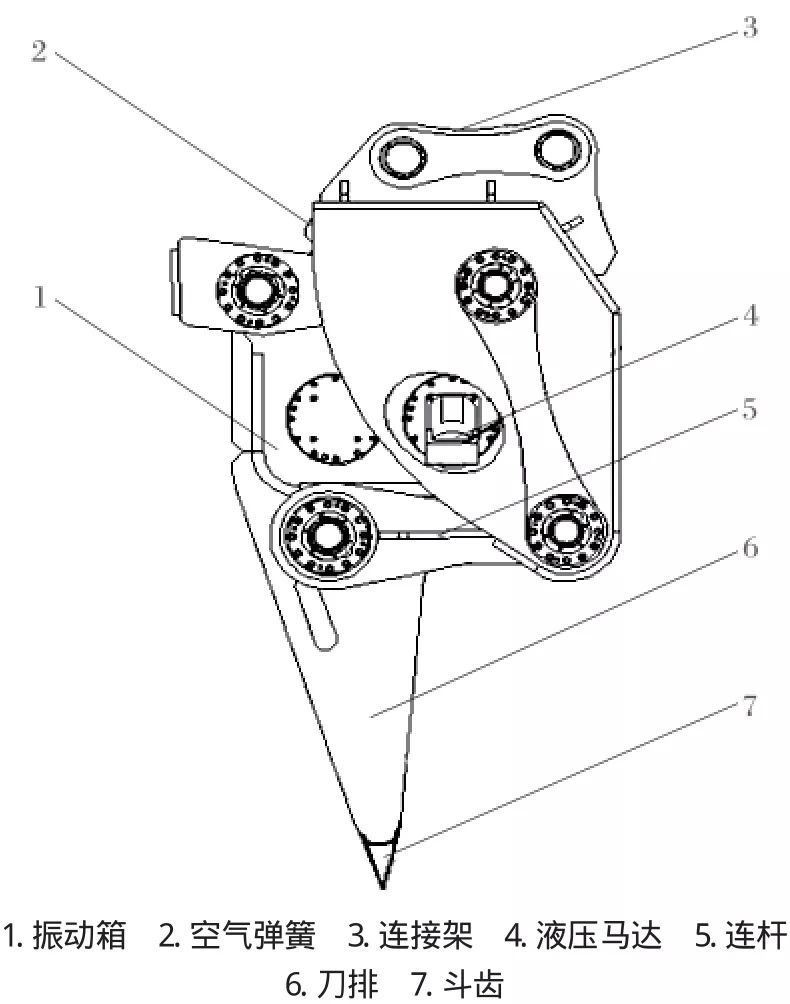 高頻破碎錘是由激振器、拉桿機構、減震機構以及刀排和斗齒組成的破碎機構,激振器設置于破碎機構上并與其靜連接,破碎機構與拉桿機構動連接,減震機構安裝于破碎機構安裝臺的上表面,如圖 1 所示。破碎機構是高頻破碎錘的關鍵部件。